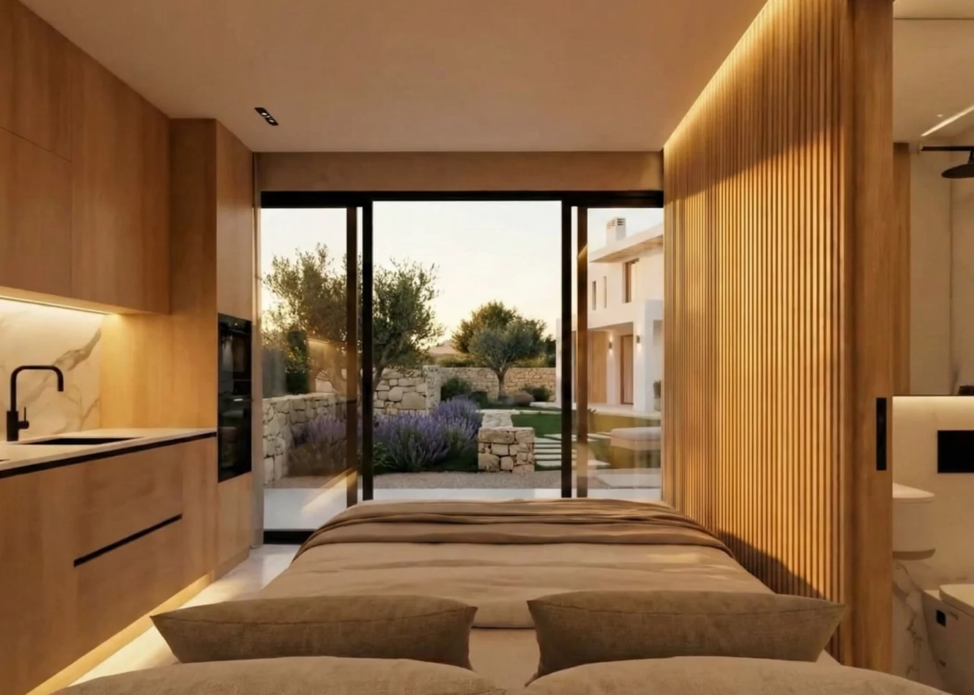 Une suite de luxe compacte face à l’horizon, lumière naturelle et terrasse intégrée.