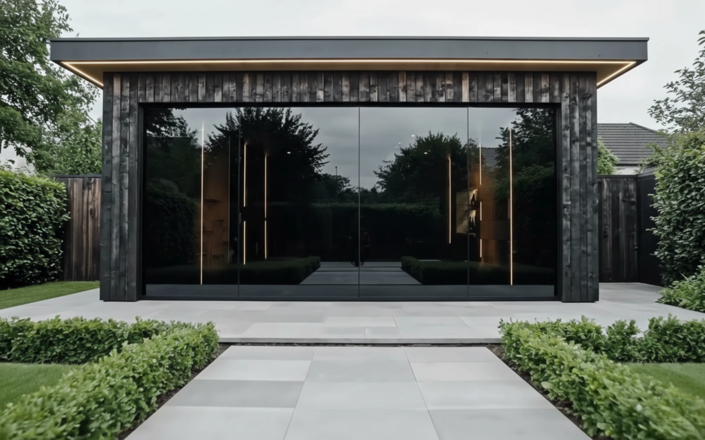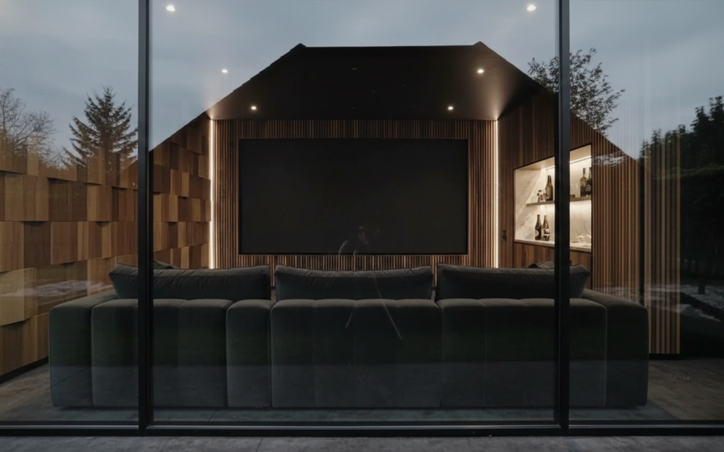 Le Cinema Lodge Pro est une salle de projection privée conçue comme une extension élégante d’une habitation haut de gamme. Le parti pris architectural est minimaliste : un unique volume sombre, vitré sur un côté, parfaitement intégré dans un jardin résidentiel. À l’intérieur, l’espace est entièrement dédié au confort visuel et acoustique, avec une ambiance feutrée, un mobilier optimisé et des matériaux spécifiquement choisis pour la diffusion cinéma. L’objectif : créer une salle de cinéma haut de gamme, immersive, fonctionnelle, sans complexité inutile.