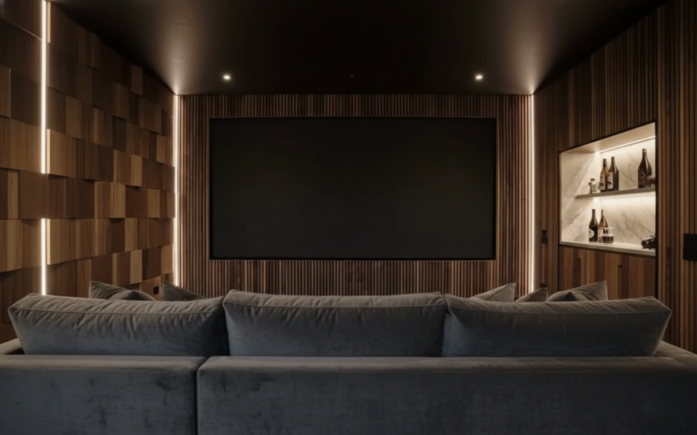 Les parois latérales jouent un rôle essentiel dans l’expérience audiovisuelle : leur composition absorbe et diffuse le son de manière contrôlée, évitant les échos et améliorant la précision sonore. L’éclairage indirect, positionné en retrait, permet de circuler sans gêner la projection tout en conservant une ambiance chaleureuse. Le choix des textures — textile dense, bois sombre, moquette épaisse — participe à une immersion totale, même en dehors des séances.