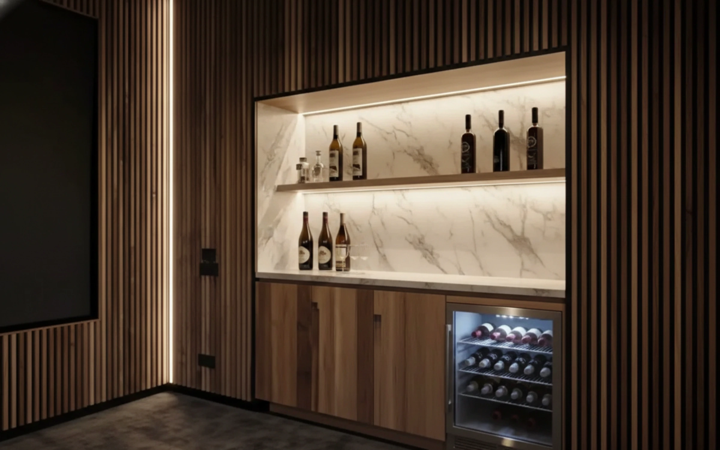 À l’arrière de la salle, une niche intégrée sert de minibar discret, éclairé par un filet LED 2700K. Son rôle est simple : offrir du confort sans casser l’expérience visuelle. Cette zone permet de stocker boissons, accessoires ou équipements, tout en restant parfaitement alignée avec le design minimaliste du lodge. Le Cinema Lodge Pro est pensé comme un espace de détente sophistiqué, capable d’accueillir des séances privées, des soirées cinéma ou du visionnage professionnel dans un cadre irréprochable.